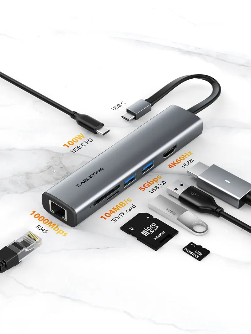 Держите свое рабочее место под рукой с портативным тонким концентратором 7 в 1 Cabletime USB C. Используйте концентратор USB Type C для подключения к MacBook Pro или устройствам USB-C, вы можете заряжать свой ноутбук, передавать данные с SD-карты и даже подключаться к сети. Эквивалент небольшой рабочей станции.