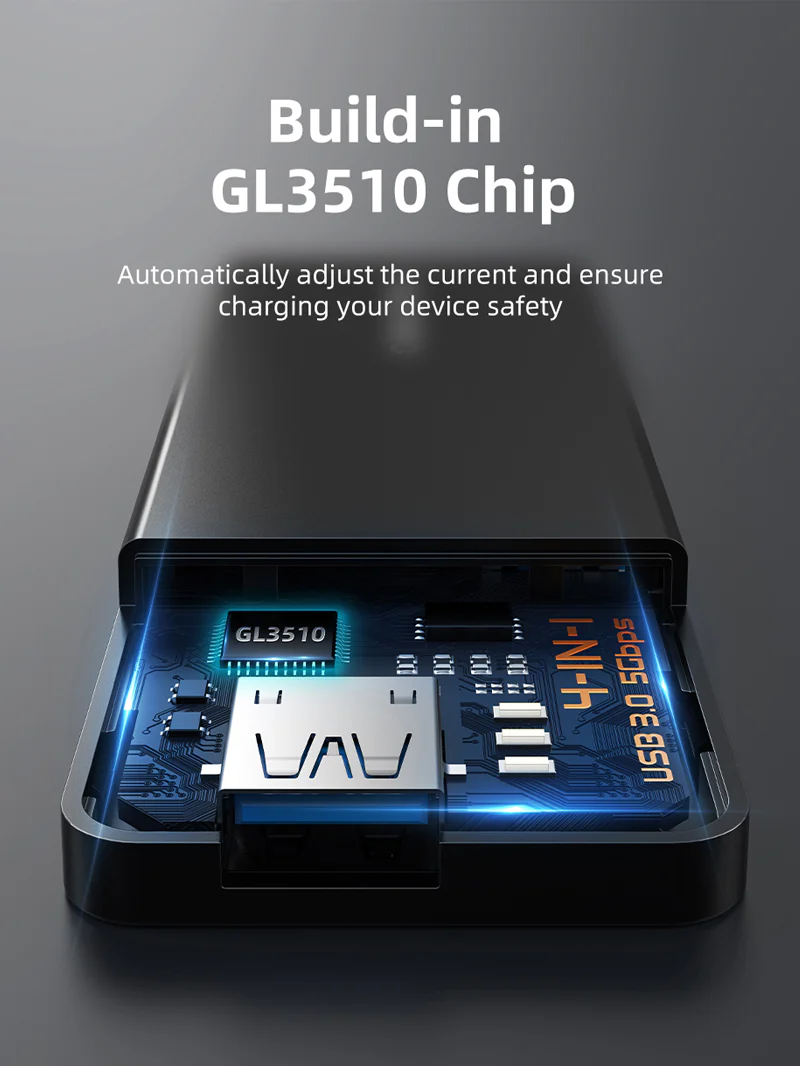 Уникальный дизайн прозрачного корпуса: Уникальный дизайн прозрачного корпуса отличает наш концентратор USB от конкурентов. Он не только демонстрирует эстетическую красоту усовершенствованного чипа GL3510 внутри, но и добавляет нотку изысканности вашему рабочему пространству. Индикатор горит во время использования. Модернизация вашей установки никогда не была такой простой и стильной.
