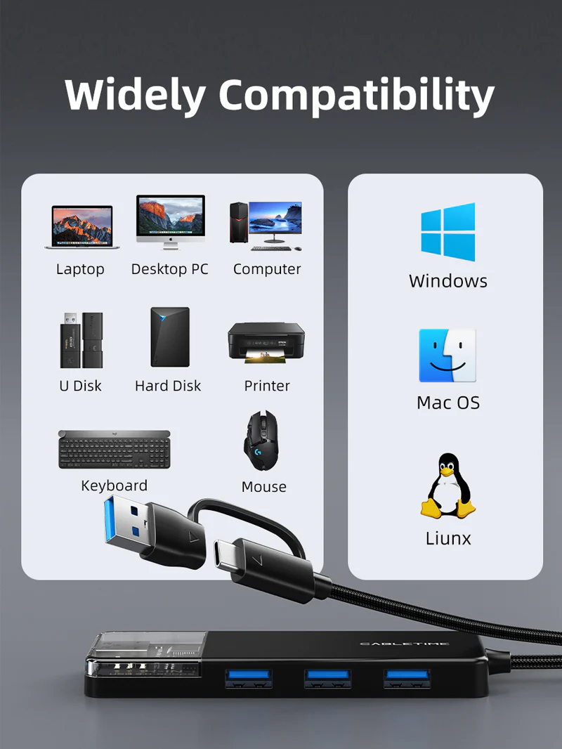 Высокая скорость передачи данных 5 Гбит/с: Концентратор CABLETIME 4-в-1 USB A+C на USB 3.0 предлагает четыре порта USB 3.0, удовлетворяя большинство ваших потребностей в подключении, таких как флэш-накопитель, клавиатура, мышь, кард-ридер, принтер, камера, USB-вентилятор и т. д. Обеспечивает передачу данных со скоростью 5 Гбит/с, что в 10 раз быстрее, чем USB 2.0, что позволяет вам быстро и эффективно передавать файлы и синхронизировать ваши устройства. Наслаждайтесь передачей данных, которая так же быстра, как и плавна!